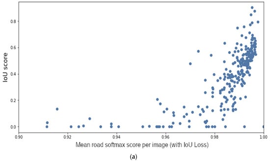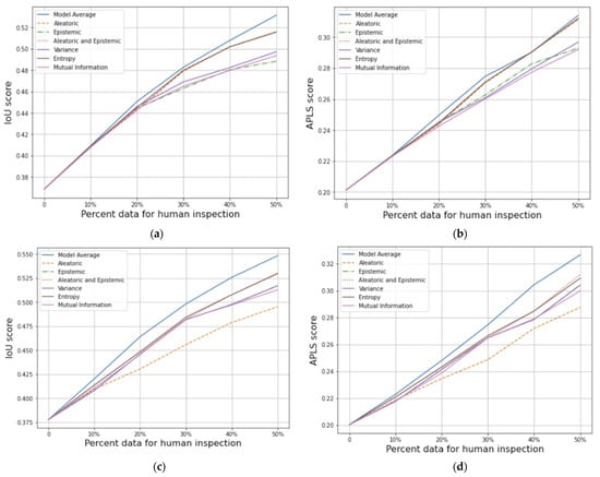 Once again, our proposed method of increasing the recall of road pixels used for uncertainty measurement, as described in Section 2.5, improves IoU and APLS scores substantially during thresholding (Figure 10). DEs again performed best across all metrics for the OOD test set. In contrast to ID data, deterministic models performed better than MCD models (Figure 11a,b). Model averages again proved more useful than all other measurements (Table 3, Figure 11c–f).