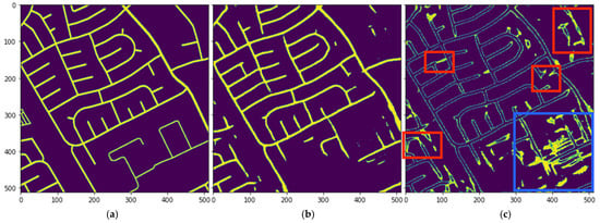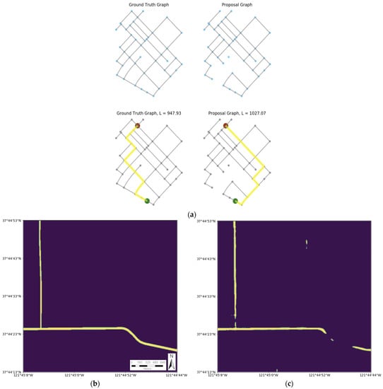 Here, we first take model predictions and transform them into graph representations (Figure 4a). In Equation (14), N is the total number of paths between all nodes in the graph, a,b represents start and end nodes of a path in the ground truth graph, a′,b′ are the closest corresponding nodes from the prediction graph, and L is a distance function. APLS is penalized both for adding edges (false positive road sections) that allow for shorter paths, and for excluding edges (false negatives) that create longer paths (see [] for more details).