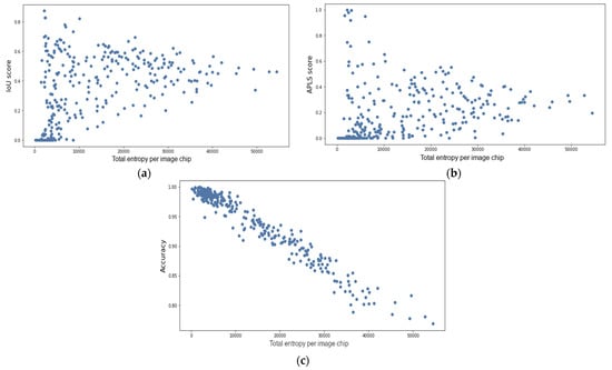 IoU (a) and APLS (b) do not correlate with entropy per image chip, despite the fact that entropy is well correlated with average pixel-wise segmentation accuracy per chip (c). IoU and APLS are much better measures of the segmentation performance of the model.