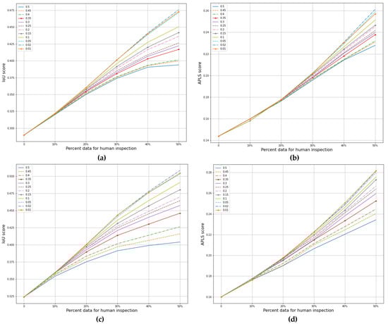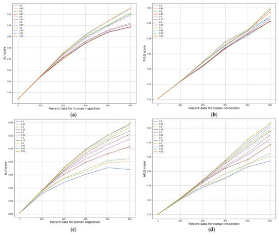 Performance comparison of MCD (a,b) and DE (c,d) model averages over varying decision thresholds for ID data. Scores increase substantially when using lower road class thresholds for uncertainty measurements, which are displayed for thresholds in the range [0.01,0.5] for the ID test set. This effect increases as more (higher confidence) image chips are sent to humans for quality assurance. The effect is more than twice as large for the DE than for MCD. The effect size for the deterministic model (not pictured) is similar to MCD.