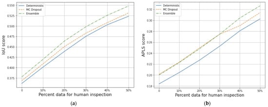 To measure the real-world usefulness of uncertainty methods, we use an experimental design proposed by Leibig et al. []. Here, the p percent most uncertain image chips are excluded from testing scores. The idea is that the image chips the model reports as most uncertain are advanced for inspection and correction by humans. We then score the model only on image chips not advanced for inspection. If model uncertainty and segmentation quality are well correlated, model scores (as measured by IoU and APLS) increase as we send more image chips for inspection.
