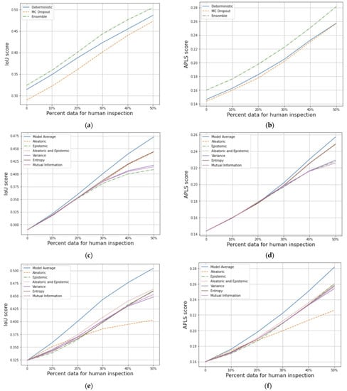 IoU (a) and APLS scores (b) over data retention rates for OOD data, and performance comparison of aleatoric, epistemic, variance, entropy and mutual information measurements with MCD (c,d) and DE (e,f) model averages on OOD data. As with ID data, DE’s perform best, and model averages perform better than other measurements at all levels of data retention.