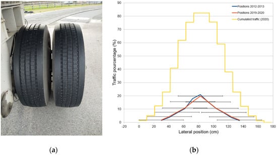 (a) Dual wheels of the carrousel, (b) Traffic density vs. lateral positions of the dual wheels per 100 K loadings.