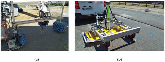 In the second group, stepped-frequency systems were used—an experimental one developed at university Gustave Eiffel working with an equivalent 5 GHz central frequency, and a second one, which is a commercial array system, working with an equivalent 1.5 GHz central frequency (Figure 4). In this paper, the “central frequency” of the SFR pulse is defined from the timely radar pulse signature as the inverse of the wavelength period. The latter is roughly determined from the time shift between successive zero crossing (or from the time difference between successive amplitude extrema). For the SFR parameters at hand, this practical definition provides intermediate value between the peak energy of the pulse in the Fourier domain (~3.4 GHz) and the center of the GPR bandwidth (~5.8 GHz).