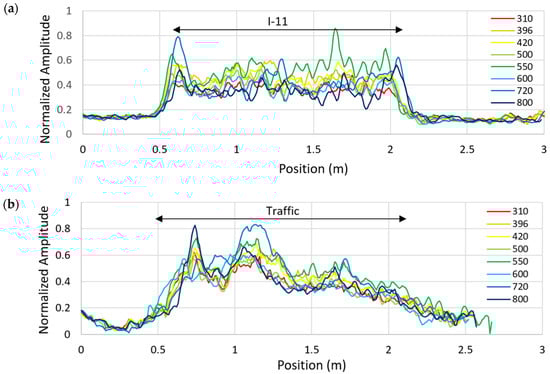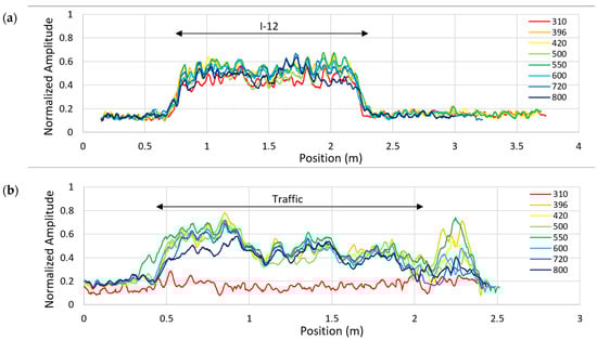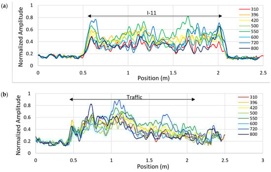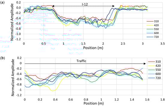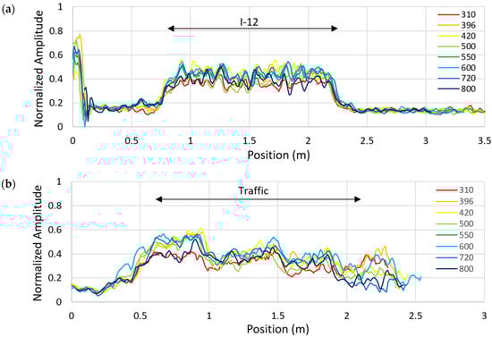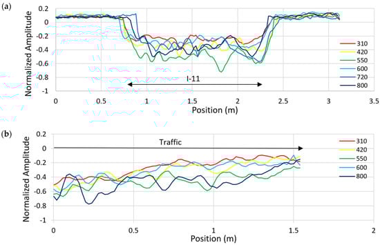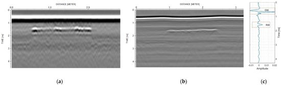 Figure 5a,b compares the pre-processed B-scan data obtained by the 2.6 GHz impulse radar and the 5 GHz SFR radar on I-11 (sand) at 720 K loadings. For the sake of clarity, the vertical time scales have been harmonized. The surface echo at the top shows the strongest amplitude, and it is called direct wave (DW) for both data types. The second strongest echo is the reflected wave (RW) from the sand-based debonded interface. The reflected echo from the healthy area shows a weaker amplitude at roughly the same time-depth.
