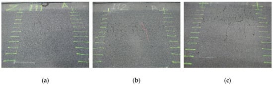 Photographs of defects (a) I-11 (sand), (b) I-12 (geotextile), and (c) I-13 (tack-coat free), at stage 800 K loadings. Paints correspond to the presumed longitudinal limits of the defects.