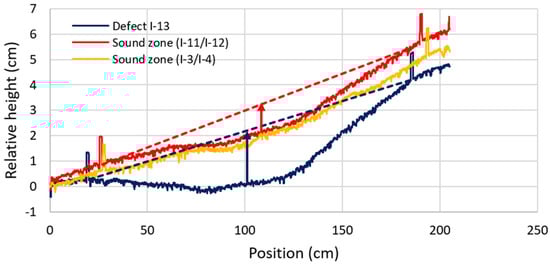 Moreover, several cross-section profiles, done with a laser rugosimeter system, were performed showing the rutting resulting from the heavy traffic. Figure 7 presents, as an example, the cross-section profiles done in the center of I-13 and in two healthy zones (between I-11 and I-13 and between I-3 and I-4), from the inner to the outer radius of the traffic path. Measurements show rutting of above 2 cm in depth at the center of the largest defects, while it remains under 1 cm in the healthy zones.