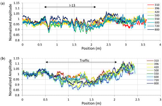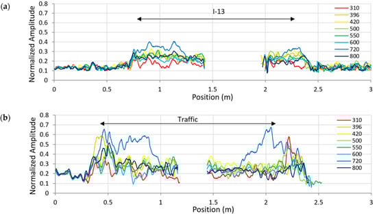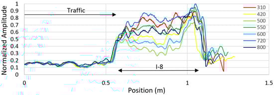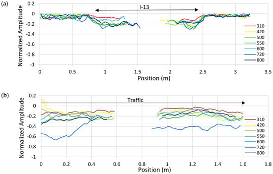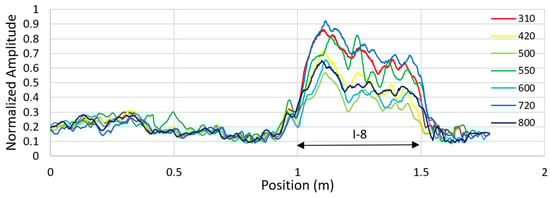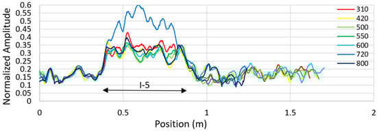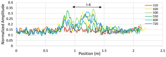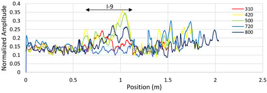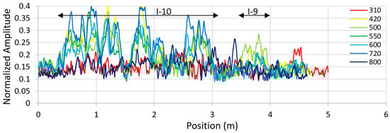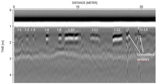 Figure 8 presents a longitudinal profile along the center of the test section at 2.6 GHz. We note that every defect is detected (I-1 location being more ambiguous) and that defects composed of geotextile (I-4, I-9, I-10, and I-12, but not I-2) show similar echoes stronger than the others, explained by stronger dielectric contrasts. Several sensors, embedded to monitor the stress under the heavy traffic, are located in the center of I-13 and between I-12 and I-13. This is why results presented for defect I-13 in the next section will show a lack of values in the center of the data.
