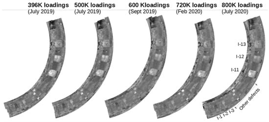 During the experiment, radar surveys were performed at periodical loading stages. In 2012, they were focused on the largest defects, and done after the construction of the test zone, at 10 K loadings (the structure being considered as consolidated), and at around 50 K, 100 K, 200 K, 250 K, and 300 K loadings. In 2019–2020, the experiment was completed by measurements done on every defect (except the univ. Eiffel’s SFR focused on I-11, I-12, and I-13) at about 310 K, 396 K, 420 K, 500 K, 600 K, 720 K, and 800 K loadings (end of the APT). All the data were realized in the summer period, except for 720 K loading stage done end of January.