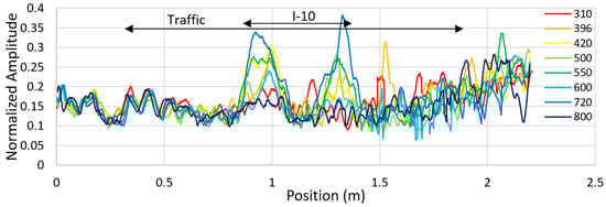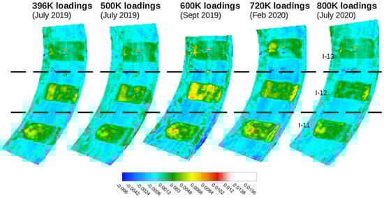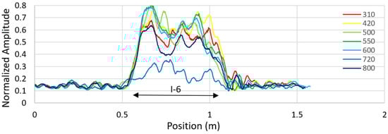 C-scans were performed at 396 K, 500 K, 600 K, 720 K, and 800 K loading stages, using the commercial software 3D-radar Examiner. Figure 9 shows the horizontal slices of the C-scans taken at the interface (or defect depth). These slices give an overview of the global test section and its general evolution. Most of the defects are clearly visible and their geometry well drawn. Nevertheless, the thickness and the EM state of the top layer varies due to the implementation and evolution of the asphalt layer. Therefore, they can present some bias in estimating the importance of the defects. So, it is interesting to study the amplitude of the surface direct wave (DW) and the echo at the interface of the two asphalt layers (RW), as shown in Figure 10 and Figure 11, picked in the area of I-11 to I-13.