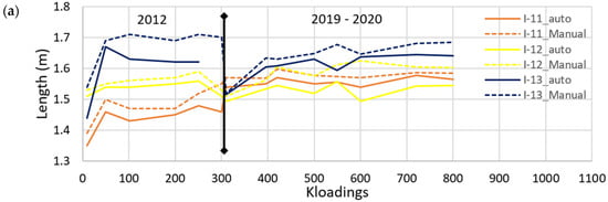 - Longitudinal data show stable values along the defect and no major defect expansion of it. As presented in Table 3, the amplitude threshold was fixed to 0.24. A complementary threshold value has been estimated around 0.20 and is varied depending on the evaluation by a GPR specialist (presented as manual length). Figure 15a shows that horizontal extension vs. traffic remain very low even if they show several centimetric increases at the beginning of the two periods. Moreover, some natural auto-repair during the intermediate period was observed.