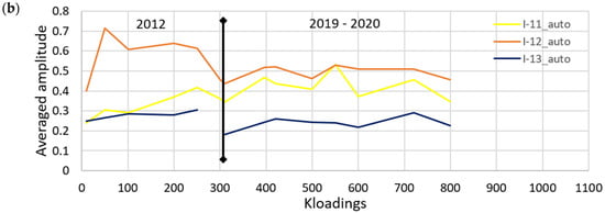 From these maps, some general observations can be made. Firstly, the heavy traffic has not induced strong lateral expansion of the defects although numerous surface cracks that appeared in the two last loading stages. The evolution of the RW amplitudes is visible on Figure 10 for increasing vs. degradation for defects I-11 and I-13 until 720 K loading stage, with defect I-12 presenting a surprisingly high amplitude level at 600 K loading stage. The last measurement stage, done in July 2020 five months after the 720 K loading one (imposed COVID confinement), shows a decreasing trend. Such a decrease of EM contrast suggests an internal moisture evaporation and possible auto-repair of the structure.
