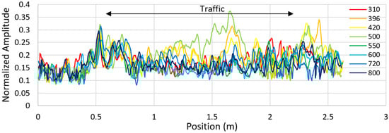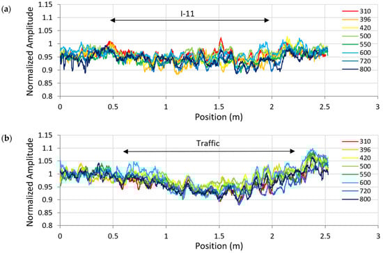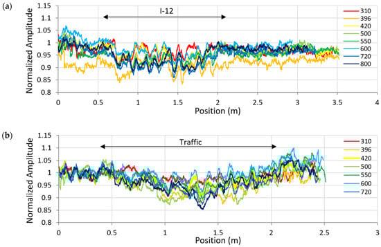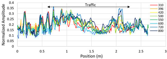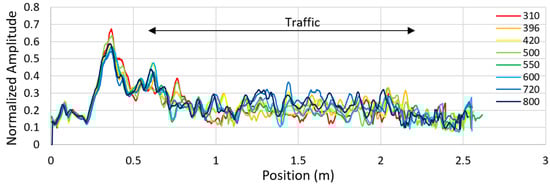 Figure 16, Figure 17 and Figure 18 gather normalized RW amplitudes picked on the defects I-11, I-12, and I-13 vs. loading, from the 1.5 GHz data. Considering longitudinal results on the central axis of the traffic, we observe roughly stable levels without any general trend vs. traffic. Similar to 2.6 GHz results, transversal 1.5 GHz values present a general trend of RW decrease while moving towards the outer edge of the test track.