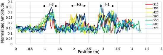 Presentation of normalized DW amplitudes of 1.5 GHz GPR profiles done on defects I-11 to I-13 during the 2019–2020 series.