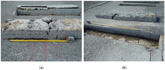 The dynamic traffic, simulated by a half-axle load for twin wheels, has been performed centered on the majority of the defects on a radius of 16 m (Figure 2a). Three hundred thousand (or 300 K) loadings were realized in 2012 [12]. As no obvious defect was detected on the structure, from a road engineer point-of-view, 500 K more loads were carried out in 2019–2020, resulting in a degradation level officially requiring repairs.