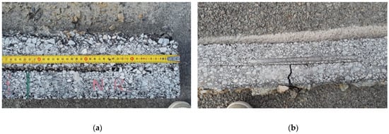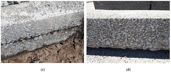 Details of defects visible on the side of asphalt slabs, based on (a) sand (I-11), (b) geotextile (I-10), (c) tack-coat free (I-13), and (d) healthy zone.