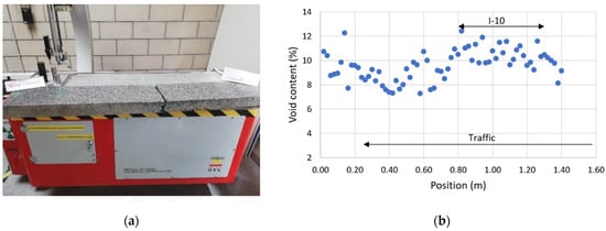 (a) Gammadensimetric acquisition on asphalt layer, (b) void content estimation vs. of lateral location.