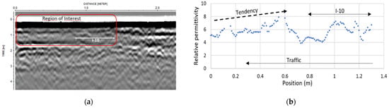 (a) 2.6-GHz transversal profile done on defect I-10 at 800 K loadings. (b) Estimation of the relative permittivity of the asphalt layer 1.