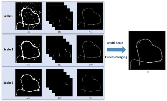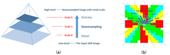 The pyramid model is shown in Figure 2a. The image size is reduced by half with each downsampling operation from the bottom up. Scale 0 corresponds to the input SAR image, which depicts image details and facilitates the extraction of narrow roads. In the high-level images, features of narrow roads gradually disappear while features of wide roads are retained, which benefit the extraction of the basic trends of roads and emphasize the location of main roads. Empirically, we find that three image scales are enough for the road network extraction task. The steps of multiscale analysis are as follows. Firstly, road area segmentation and directional-based image decomposition are performed on various image scales independently. After that, the decomposed image layers with different sizes are interpolated to the original image size through the nearest neighbor interpolation algorithm. Then, regional quality evaluation and the thinning operation are carried out. Finally, multiscale information fusion is implemented by the combination of weighted curve images.