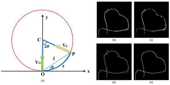 In the second stage of dense voting, the ball component of each tensor is discarded and the stick component is retained for voting with stick kernel. The diagram of stick voting is illustrated in Figure 6a. Suppose that and represent the normal vectors of voter O and receiver P, respectively. The most likely path from O to P is a circular arc with constant curvature. The saliency decay function of the stick voting can be written as follows: