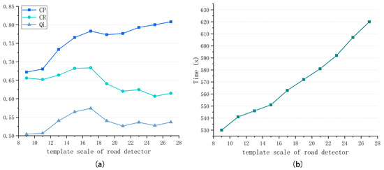 Quantitative analysis of road network extraction results with different template scales of road detector. (a) Completeness (CP), correctness (CR), and quality (QL). (b) Time consumption.