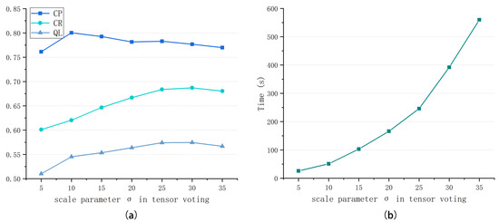 Quantitative analysis of road network extraction results with different scale parameters in tensor voting. (a) CP, CR, and QL. (b) Time consumption.