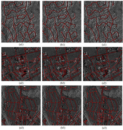 To test the practicality of the multiscale framework in the road network extraction task, a similar algorithm conducted on a single scale (original scale) is implemented, denoted as Comparison 1. As the template size of directional road detector is fixed in this paper, the multiscale framework plays an important role in extracting road targets with different widths; thus, a D1D2 operator [6] with diverse template orientations and sizes is used as the road detector in the single-scale contrast experiment. Beyond that, we use the same thinning and refinement method to obtain extracted results. As shown in Figure 11a, the completeness and continuity of road networks obtained by Comparison 1 are inferior to that extracted by our method for more gaps. Furthermore, the values of CP, CR, and QL distinctly decline in Comparison 1. In the image pyramid, high-level images can reflect the overall trend of the road network and tend to extract wider main roads. In contrast, low-level images are rich in details and used to extract narrower paths. The employment of the multiscale framework combines the extraction results of different levels; hence, a relatively complete network can be obtained. Although the multi-direction and multi-size D1D2 operator adopted in Comparison 1 likewise has the ability to detect road targets with different widths, its fault tolerance rate is not up to the proposed method. The quality of extracted network is closely related to the quality of CCs in directional decomposed image layers. However, the CCs in Comparison 1 are determined by the once generated direction map, which is less reliable due to the randomness of local information. Considering both scattering CCs from well-detailed low-level images and regular CCs from trend-salient high-level images, the proposed method integrates the multiscale information based on weighted summation and tensor voting to produce promising results.