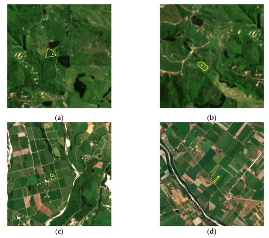 Four examples of sites with measured biomass (white), with hand-drawn polygonal field boundaries (yellow). These are sites with IDs (a) 3, (b) 4, (c) 16, and (d) 20. These images are true-colour representations of a mosaic of top-of-atmosphere corrected Sentinel-2 data from the 2017/18 summer.