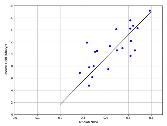 The data collated in Table 1 were suited to a linear model and had a range of pasture yields from 4.8 t/ha/y to 17.2 t/ha/y. Median NDVI in the corresponding range of the input data could be used in the model to estimate pasture yield. Outside the range of measured pasture yields, this model is less applicable. For instance, the linear trendline indicated that pasture yield would be nil if the mean median NDVI dropped below 0.157; however visual inspection of sites with values below this showed pasture which must have some positive yield. Therefore, it is likely that pasture yield with respect to median NDVI is asymptotic as it approaches 0 t/ha/y. More field data from sites with very low pasture yield are needed to extend the model. Seasonal effects on pasture productivity could also be assessed if seasonlized field data was available.