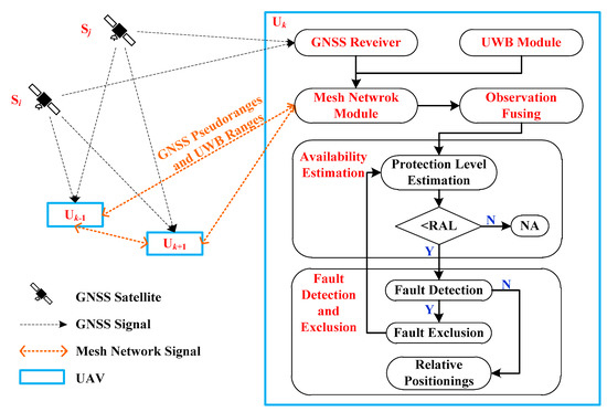 To improve the performance of autonomous integrity monitoring for multi-UAV relative navigation, a novel method is proposed with the fusion of the double differenced GNSS pseudoranges and the UWB ranging units. Compared with other sensing devices obtaining relative navigation measurements, UWB stands out in accurate and reliable ranging due to its ability to alleviate multipath effects and robustness to light changing [31,32]. Inspired by the existing work of UWB positioning system, this paper proposes a new method using the relative distance measurement of UWB signals as an aid to improve the integrity performance of multi-UAV relative navigation. First, a new framework of autonomous integrity monitoring for multi-UAV relative navigation is proposed. Then, the proposed method is designed to detect and exclude the fault observations through a consistency check in the relative position of multi-UAV using double differenced GNSS pseudoranges and UWB relative range observations. Note that this work only considers the faults on GNSS observations, while the problem of fault detection and exclusion for multiple sensors of a cooperative system in the concept of integrity will be researched in the future, which is usually regarded to be much more difficult [30]. Finally, the protection level for multi-UAV relative navigation is calculated, which is used to advise whether to meet the requirements of the flight mission. To verify the effectiveness of the proposed method in autonomous integrity monitoring for multi-UAV relative navigation, simulated experiments derived from the real data are designed. The experimental results show that the proposed method outperforms the baseline integrity monitoring method in fault detection and exclusion.