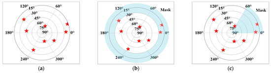 The sky maps of visible satellites. In the polar coordinate, the polar diameter and the polar angle refer to the elevation angle and the azimuth angle, respectively. The blue bands represent the masks of satellite observations in different conditions, (a) Original observations; (b) 30° elevation mask; (c) 60° azimuth mask.