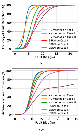 The performance of fault detection and exclusion in three different cases, (a) Results of fault detection rate; (b) Results of fault exclusion rate.