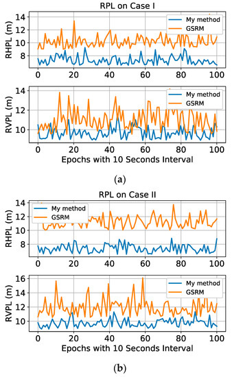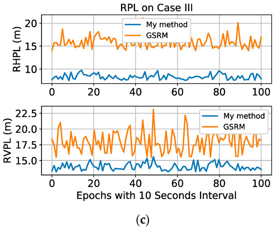 The RPL results of my method and GSRM in three different cases. Specifically, the Relative Horizontal Protection Level (RHPL) and the Relative Vertical Protection Level (RVPL) are estimated and compared separately to test the performance of the proposed method, (a) RPL results in Case I; (b) RPL results in Case II; (c) RPL results in Case III.
