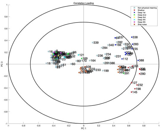 As shown in Figure 5, the abscissa is PC 1 and the ordinate is PC 3. There are 2 circles in the plot, in which the inner and outer ones indicate 50% and 100% explained variance, respectively. The points between the two circles are the significant features that can explain at least a 50% variance of the data. And the legend with different colors illustrates different sets of tones and the ship noise.