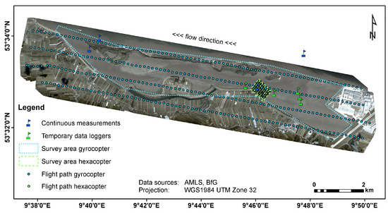 Additionally to the gyrocopter survey, a hexacopter (6-rotor UAV) acquired multispectral and thermal data (see Figure 3). Due to flight altitude and range of the hexacopter, it covered a far smaller survey area at a higher spatial and temporal resolution than the gyrocopter (0.25 km). A section of intertidal mudflats and a fairway in front of the dike south of the Hahnöfer Nebenelbe was chosen for a detailed survey, where the temperature differences are especially pronounced during the tidal cycle. Only one continuous measurement station was located inside the survey area, but the area boundaries could not be modified due to the necessary accessibility and line of sight. The hexacopter pilot operated the UAV based on a dike at the southern river bank. The flight altitude was limited to 100 m due to the bird sanctuary next to the survey area.