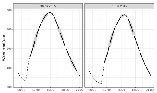 Flight times for hexacopter (solid black line) and gyrocopter (thick grey line) as well as water level (slashed black line) in the survey area at the Hahnöfer Nebenelbe.
