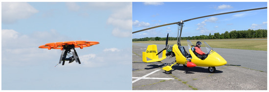 Flight platforms used for the survey: hexacopter with a camera system on a gimbal (left) and gyrocopter with the camera system to the pilot’s right under the red cover (right).