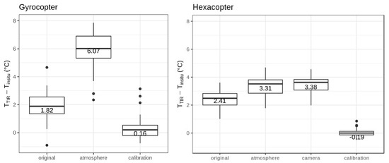 After atmospheric and camera flat field correction, the remaining difference between and can be explained by two error sources: a camera (calibration) error and the skin effect (see Section 2.2). During the survey reference measurements with mobile calibration targets (i.e., water-filled boxes with a temperature data logger) have been conducted before each flight of the TIR sensors but led to inconclusive results about the data bias related to calibration error and skin effect (results in [53]: mean difference during the calibration between and was −1.63 C, and between and was 1.36 C. If we regard the mean temperature differences after emissivity and atmospheric correction during the flight, the bias of the hexacopter data becomes slightly larger during the flights, while the gyrocopter bias changes significantly and overestimates during flight.