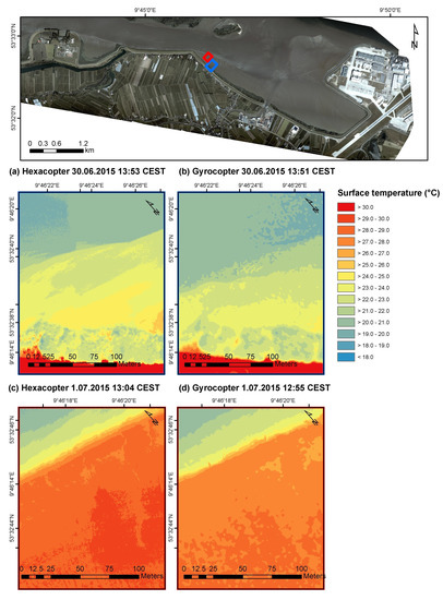 Good contrasts and temperature patterns were visible due to the chosen acquisition time and relative sensitivity of both sensors. The hexacopter images had a better spatial resolution and less noise (see also variance in comparison of with in Figure 4), either due to the sensor or the smaller atmospheric effect related to the lower flight altitudes. The gyrocopter data sets exhibited a more stable sensor calibration between individual images and better geo-referencing due to the use of SfM for the post-processing compared to the mosaicked hexacopter images. Dynamic diurnal temperature changes were detected, especially around the water temperature of 20 C, which is essential information for water quality monitoring. During certain tide phases, the temperature patterns changed faster than they could be captured by both gyrocopter and hexacopter as the systems required one hour to cover their respective survey areas completely. So it has to be considered when analysing the time series that they “do not provide a truly synoptic assessment” [36].