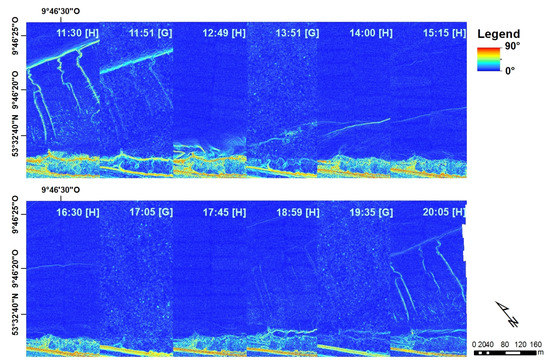 The temperature differences are typically much more pronounced over the land surface than over the water, making interpretation of the thermal landscape of the water more challenging. For further analysis and easier identification of distinctive temperature patterns and changes, the temperature gradient has been calculated for the mosaics with the ArcToolbox function slope (ArcGIS Desktop 10.3, ESRI, https://desktop.arcgis.com/de/ (accessed on 6 April 2021)). Figure 12 shows a temperature gradient mainly between the tidal channels and the mudflats at low tide (∼11:30). This gradient also represents the land-water boundary. The water level marches up to the dike during the rising tide. After the water level reaches the local shoreline, a diagonal water front is visible between the cold water transported in by the tide, and the upwelling water warmed by the heated mudflats which is upwelling at the shore and moves Southwest with the further rising water (13:51, 14:00, 15:15, 16:30).