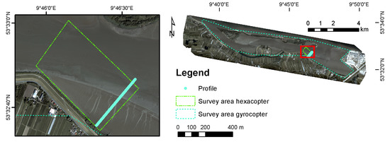 Location of the profile across the intertidal mudflats and the tidal channel within the hexacopter and gyrocopter survey area. The extent of the detailed map is marked by a red rectangle in the overview image on the right.