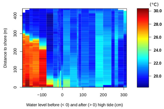 Again, there are substantial temperature differences of about 8 C visible between the heated mudflats (∼28 C) and the colder water (<20 C) in the channels until high tide (HT) is reached (the emissivity value for water is applied to all areas). The water-mudflat boundary and the temperature boundary move towards the shore with the rising water level until ∼HT-50 cm. Near the shore around HT, medium warm temperatures (∼24 C) can be observed from the upwelling water heated by flowing over the warm mudflats. At the tidal turning point, a seemingly evenly mixed water temperature along the profile is reached ∼HT + 100 cm. With the further falling water levels after HT, slightly warmer water from direct contact with the mudflats and upstream covers the whole profile ∼HT + 200 cm. The last profiles around ∼HT + 300 cm then show the reemerging cooler mudflats and the mixed, warmer water in the channel.