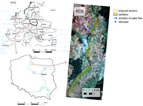 After the visual inspection of the Sentinel-2 image, recorded on 20 August 2015, the following reaches were selected for analysis: 852–866 km, 870–874 km, and 879–885 km (Figure 1). The short reaches of 866–870 km and 874–879 km were excluded from the analysis, since they are located at the bends of the lower Vistula River channel where stationary point bars develop.