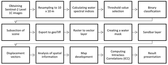 The detection of the alternate bars on the river can be assisted by the remote sensing methods, based on the satellite multi-spectral image processing. It is possible to detect and delineate the sandbars in the river channel by using spectral indices, defined as mathematical expressions with a minimum of two wavelengths of spectral reflectance. An application of the water indices makes the automation of image processing possible. The equations contain universal variables, which do not depend on the sensors of the image recording device. The water indices used for the delineation of water from the background also require the definition of the fixed threshold values [6]. In the literature, their researchers report a variety of spectral indices used for the land-water delineation. One frequently used is Normalized Difference Water Index (NDWI), developed by McFeeters [7]. Another important index is Modified Normalized Difference Water Index (MNDWI), which was proposed by Xu [8]. Other indices frequently appearing in the literature are Automated Water Extraction Index shadow (AWEIsh) and Automated Water Extraction Index no shadow (AWEInsh), developed by Feyisa [9]. Indices such as Land Surface Water Index (LSWI) and Modified Land Surface Water Index (MLSWI) are also used to detect water surfaces [10,11]. An overview of the land-water detection remote sensing indices was performed by Robak et al. [12], as well as Kryniecka and Magnuszewski [13].