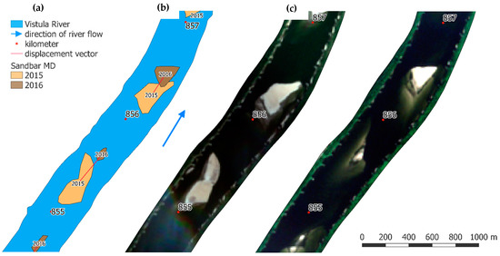 Example of the alternate sandbar shift on the lower Vistula River between 855 and 857 km: (a) estimated from the vectors connecting centroids of polygons, manually delineated (MD), on the Sentinel-2 images recorded on 20 August 2015 and 4 September 2016; (b) true color composite RGB from Sentinel-2, recorded on 20 August 2015; (c) true color composite RGB from Sentinel-2, recorded on 4 September 2016.