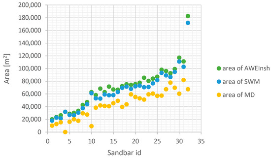 To estimate the absolute compatibility between the three methods of sandbar delineation (AWEInsh, SWM, and MD), 32 sandbars were selected in the Sentinel-2 image, recorded on 20 August 2015. For statistical analysis, an interclass correlation coefficient (ICC) was applied to compare the alternate sandbar areas. The results of the ICC analysis (Figure 5) showed that there is a high degree of reliability and homogeneity of the areas obtained with AWEInsh, SWM, and MD methods of the sandbar delineation (statistical significance level: p < 0.001). The measurement reliability is ICCsingle = 0.550, while the measurement reliability, being the mean of the three methods used, is slightly higher and amounts to ICCaverage = 0.786. The data were prepared by sorting, to better illustrate the correlations and relationships between them. Greater compliance applies to the SWM and AWEInsh spectral index methods, while a lower compliance is obtained in the case of the MD. The results are more consistent in the domain of smaller sandbar areas. The tendency of oversizing of sandbar areas obtained by automatic methods, based on SWM and AWEInsh indices, is visible. It can be explained by the fact that a large sandbar’s visual interpretation, with the use of a true color composite image (bands 4, 3, and 2), often leads to the delineation of separate forms, while automatic methods merge smaller forms into one unit.