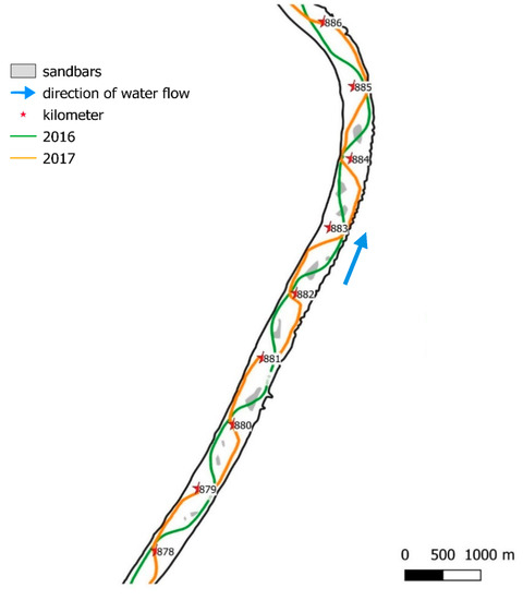 To confirm the movement of alternate sandbars, a location of the shipping waterway on the lower Vistula River was measured with an echosounder. The measurements were done with a Lowrance HDS5 sonar and GPS receiver for two consecutive years: 4 September 2016 and 14 July 2017. The sonar was mounted on a motorboat following the thalweg in a shipping lane, shown by bank navigation marks. The sonar georeferenced data were transformed in the ReefMaster program to a vector shape format and displayed on the river channel map in Figure 6. The comparison of the alternate sandbar locations on the studied range of the lower Vistula River shows that their location and the pattern of the shipping lane is repeating approximately every 3 years. This is an approximation because the time interval between image registrations is about one year. It was an intention to analyze images recorded in low flow conditions in time intervals covering complete phases of the hydrological regime of the river. The movement of the alternate sandbars controls the thalweg position and shipping lane geometry.