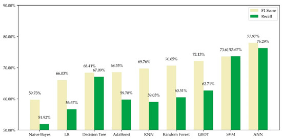 Performing well in classification and regression issues, machine learning (ML) was introduced. Taken as a subset of artificial intelligence, ML is the study of computer algorithms that improve automatically through experience. ML algorithms build a mathematical model based on sample data (known as “training data”) to make predictions or decisions without explicit programming. There are many ML algorithms that have solid mathematical foundations, such as logistic regression (LR), K nearest neighbor method (KNN), decision tree (DT), random forest algorithm (RF), naïve Bayes algorithms (NB), Support Vector Machine (SVM), ANN, among others [4,5,6,7]. All the above algorithms perform well in solving classification issues under normal circumstances, but we are not sure whether they are suitable for our specific situations. A series of tests were then conducted and ANN was identified as the optimal algorithm (see Section 4.1), perhaps because of its powerful nonlinear fitting ability. It is notable that F1 score, harmonic mean of precision and recall, was prioritized as precision and recall were taken superior to accuracy (samples were unevenly distributed).
