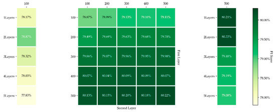Based on reinforced learning, Network Architecture Search (NAS) is a hot field in deep learning [32,33]. Although our model tends to shallow learning, NAS was still adopted to identify the best structure of network. Our method prioritized two factors: number of hidden layers and neurons of each layer. Brute force search was conducted to obtain the best model. Similarly, tests for each model were repeated for 300 times and the mean value of best F1 score was recorded. The results can be seen in Figure 8.