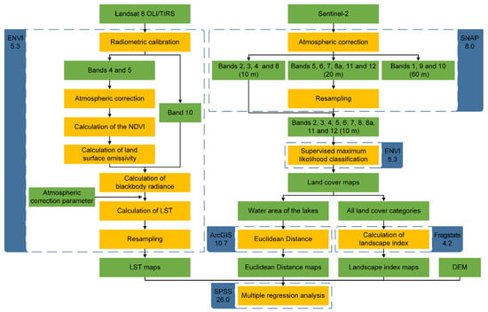 This study attempted to detect the cooling effects and scales of urban lakes using Landsat 8 OLI/TIRS and Sentinel-2 data. Herein, to accomplish this objective, the overall workflow was designed as follows (Figure 2), with four main procedures including: (1) LST inversion based on Landsat 8 OLI/TIRS images; (2) supervised maximum likelihood classification based on Sentinel-2 images; (3) landscape metrics measurement; and (4) multiple regression modeling of LST based on Euclidean distance maps, landscape composition and configuration indices, and digital elevation model (DEM).